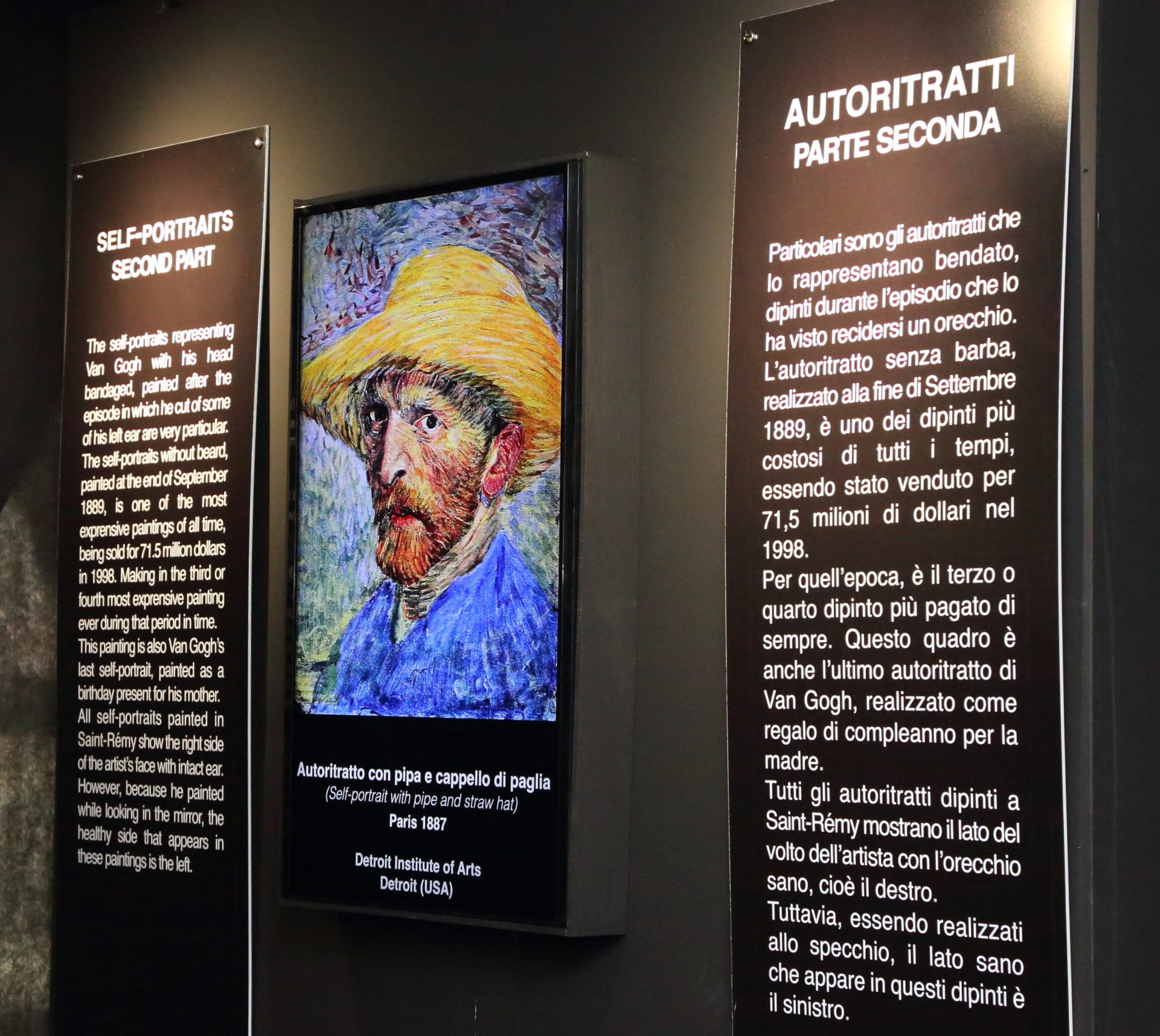 Nell’esposizione, in lingua italiana e inglese ed estesa in uno spazio di oltre 700 mq, l’opera di van Gogh è suddivisa per aree tematiche, mostrando al pubblico ritratti, paesaggi, autoritratti e nature morte, mentre nella Stanza segreta appaiono per la prima volta incisioni, acqueforti, acquerelli, dipinti a olio originali e rappresentativi di un ampio periodo, dalla seconda metà dell’800 al primo ventennio del ‘900.