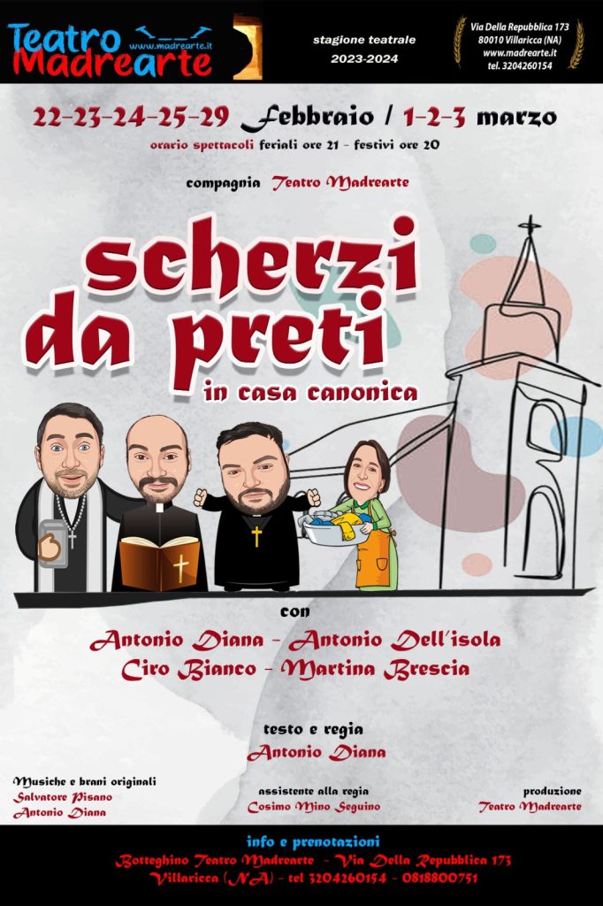 Antonio Diana torna in scena al teatro Madrearte di Villaricca dal 22 febbraio al 3 marzo 2024 con la commedia teatrale “Scherzi da preti in casa canonica”.