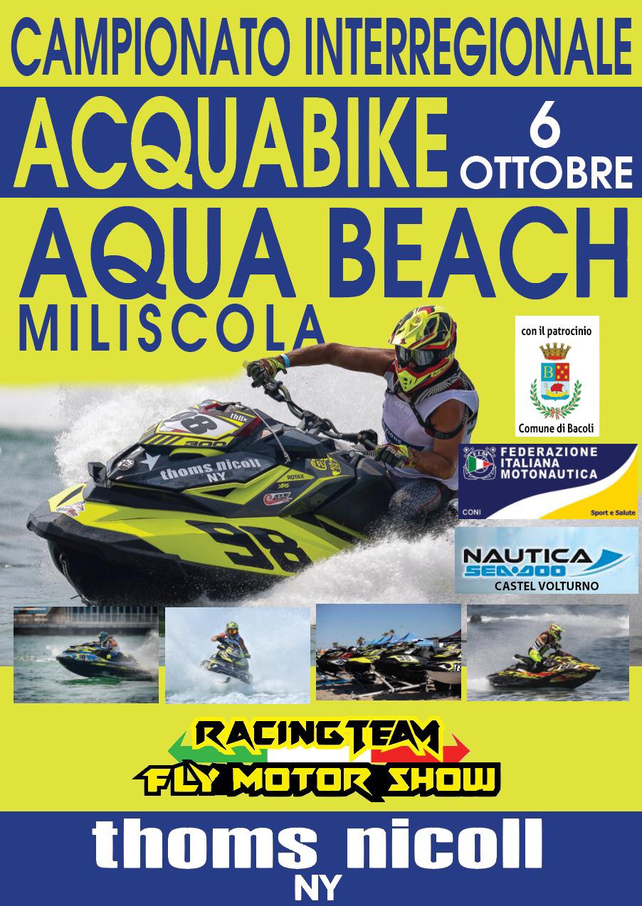 Pioggia di medaglie per il team Fly Motor Show Thoms Nicoll nel Campionato Italiano Aquabike, che si è concluso domenica 22 settembre con la tappa organizzata al lido Varca d’Oro di Giugliano dal club campano con il comitato regionale della Federazione Italiana Motonautica, presieduto da Antonio Schiano di Cola. Una tappa avvolta da un velo di tristezza a causa dell’incidente mortale occorso a Fabio Buzzi e al suo equipaggio, ai quali è stata dedicata la gara che si è svolta senza i festeggiamenti di rito in segno di lutto.