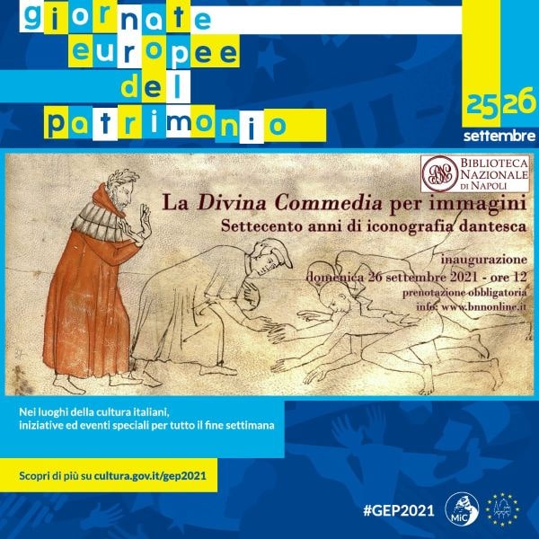 Giornate del patrimonio 2021: dal 26 settembre al 31 gennaio 2022 sarà aperta la mostra “La Divina Commedia per immagini. Settecento anni di iconografia dantesca” alla Biblioteca Nazionale di Napoli.