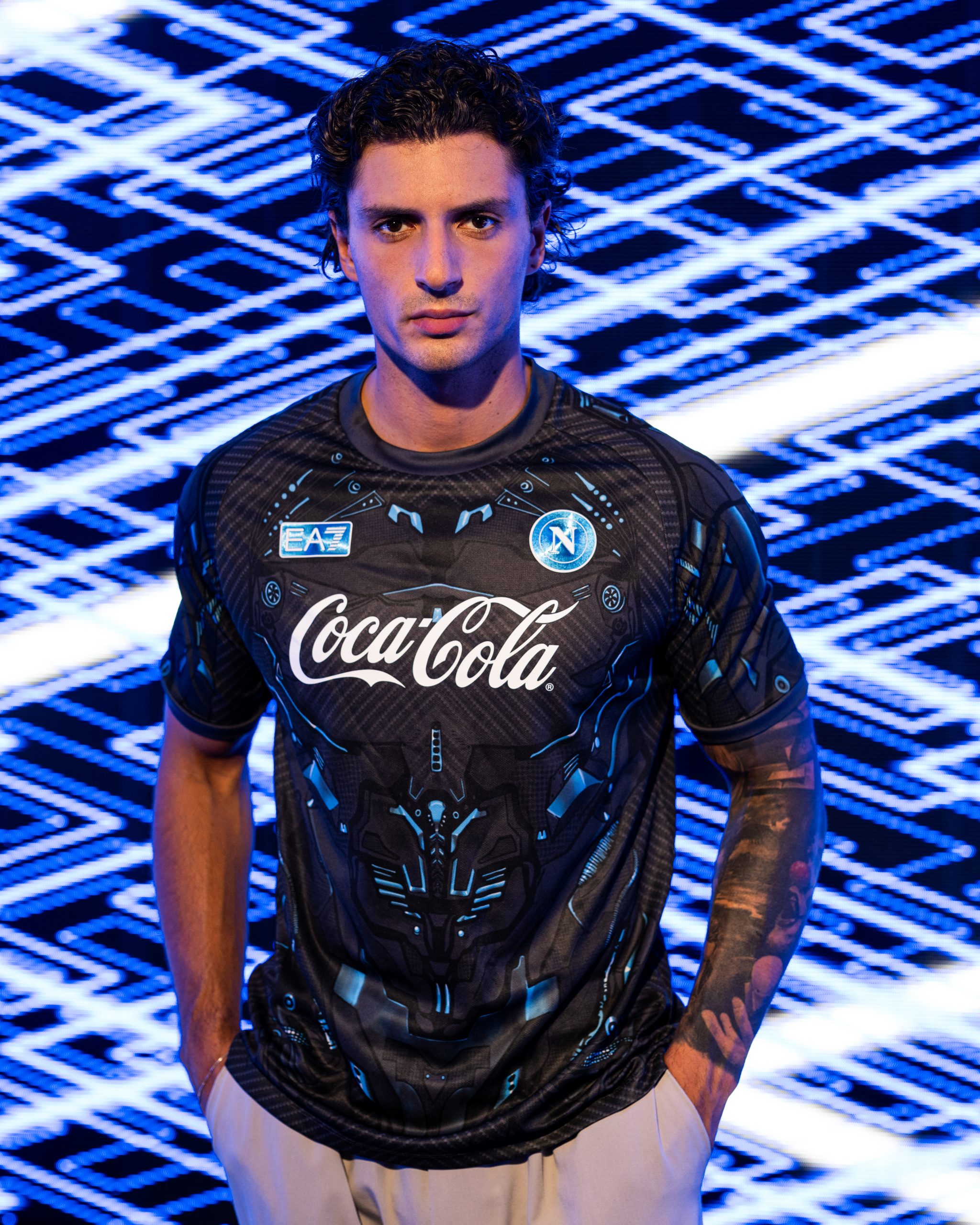 Dopo il grande successo della scorsa stagione, l’iconico logo Coca-Cola torna ad arricchire la linea training della SSC Napoli, che quest’anno si ispira all’universo “Cyborg”. Il concept è quello dell’uomo bionico, una celebrazione della perfetta sintonia tra atleta e tecnologia. Il risultato è un design futuristico che richiama linee metalliche e circuiti elettronici, attraverso dettagli in contrasto che evocano il potenziamento del corpo umano in ogni elemento della divisa.