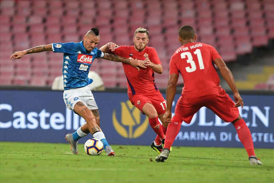 Il Calcio Napoli cerca subito di prendere in mano la gara ma nel primo tempo la squadra viola riesce non solo a fermare le offensive azzurre ma, in contropiede, si rende pericolosa con Chiesa mentre Karnezis si esalta deviando un tiro dal limite dell’area oltre la traversa. si può dire che questa è la prima parata di un portiere del Calcio Napoli in campionato.