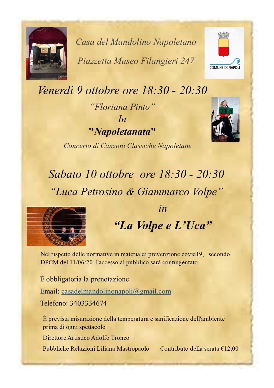 Casa del Mandolino Napoletano: venerdì 9 ottobre Floriana Pinto in Napoletanata. Sabato 10 ottobre Luca Petrosino e Gianmarco Volpe in La Volpe e L’Uca.