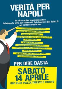 Il 14 aprile sarà un sabato di manifestazioni a Napoli. Non molto distanti tra loro ci saranno due cortei: in Piazza Municipio, la manifestazione contro il debito ingiusto, mentre in Piazza Trieste e Trento ci sarà quella dei comitati Verità per Napoli.
