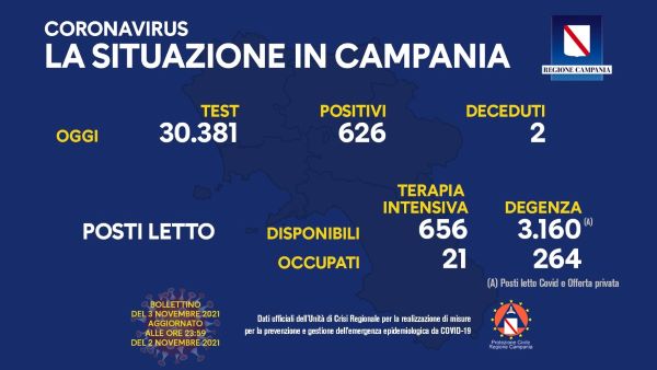 L’ultimo bollettino sui contagi da Covid 19 in Campania, aggiornato a ieri, martedì 2 novembre, parla di 626 nuovi positivi su 30381 tamponi analizzati.