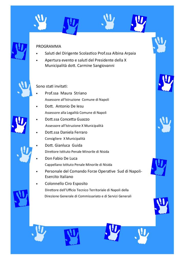 Nel corso dell’iniziativa saranno presenti esponenti dell’ANCRI della sezione di Napoli dell’associazione nazionale insigniti Ordine al Merito della Repubblica Italiana, Associazione Rigenera Campania, il presidente Fondazione “I Care” Antonio Mallardo. Alle 11 è prevista la presenza di una rappresentanza dei vigili del fuoco che illustreranno con slides e informazioni i loro compiti e il servizio che svolgono. A fine giornata torneranno i militari dell’esercito.