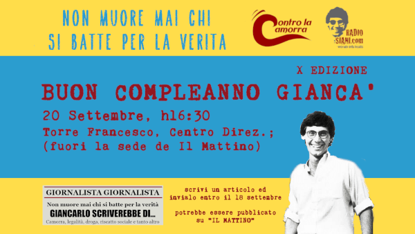 Oltre l’evento “Buon compleanno Gianca’”, ormai giunto alla decima edizione, infatti, l’associazione ‘Contro la Camorra’ e Radio Siani hanno lanciato “Giancarlo scriverebbe di”, contest giornalistico aperto a tutti.