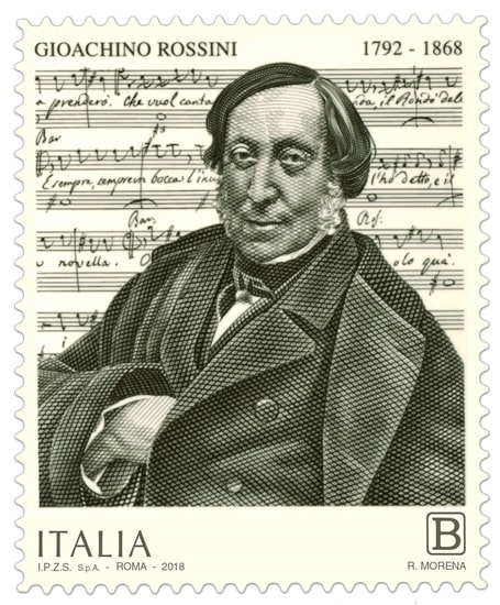 Poste Italiane comunica che oggi 13 novembre 2018 viene emesso dal Ministero dello Sviluppo Economico un francobollo ordinario appartenente alla serie tematica “il Patrimonio artistico e culturale italiano” dedicato a Gioachino Rossini, nel 150°anniversario della scomparsa.