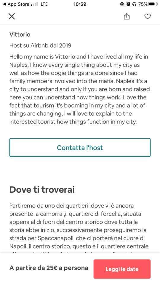 Mafia Tour | Su Tripadvisor, sul portale Airbnb e sulle piattaforme social sembra che sia possibile prenotare, per una somma a partire da 25 euro, un “Tour della Mafia”, un giro turistico per vicoli di Napoli tra le storie e le realtà di camorra, questo è quello che promette l’autore dell’iniziativa, Vittorio. Il tour durerebbe circa un’ora in cui si visiterebbero i Quartieri Spagnoli, Spaccanapoli e Forcella, luoghi fortemente contaminati dalla malavita, come viene descritto nelle specifiche del tour, apprendendo le dinamiche della camorra, che controlla le citate zone. L’ideatore di questa discutibile iniziativa, sul suo profilo Airbnb, racconta di come la sua esperienza sull’argomento mafia sia derivante anche da legami, anche familiari, con i clan.