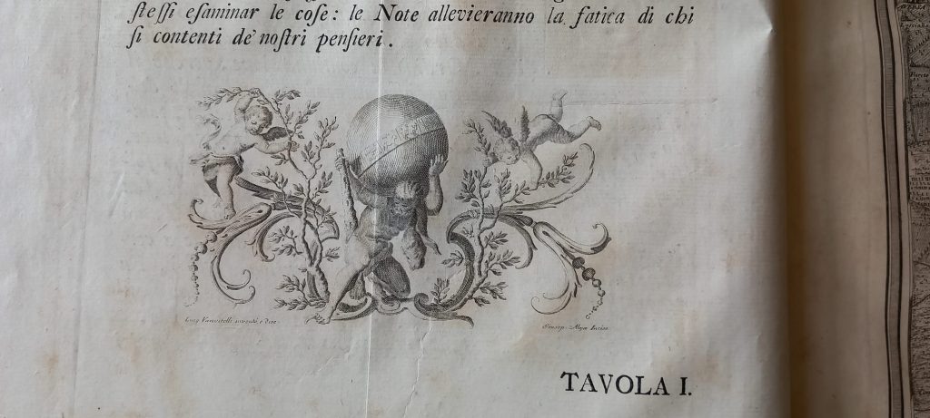 L’incisione finale [ di Giuseppe Aloja su disegno di Vanvitelli, rappresenta Ercole che sostiene il globo, accompagnato da due putti e vari ornamenti
