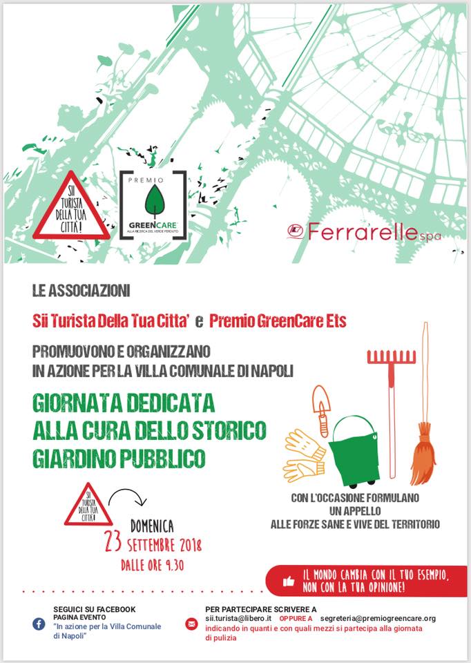 Domenica 23 settembre (ore 9) i napoletani si metteranno all’opera per ripulire dal degrado la Villa Comunale. L’iniziativa è stata promossa e organizzata dalle associazioni Sii Turista della tua Città e Premio GreenCare Ets, in collaborazione con l’assessorato al Verde del Comune di Napoli e il Museo e Real Bosco di Capodimonte.