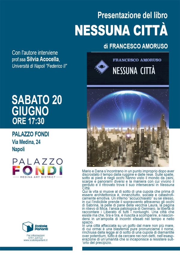 Esce in libreria Nessuna Città, il nuovo romanzo di Francesco Amoruso pubblicato dalla casa editrice Scatole Parlanti (collana Mondi, pp. 136, euro 14), che verrà presentato sabato 20 giugno alle ore 17.30 a Palazzo Fondi, progetto di valorizzazione temporanea dell’Agenzia del Demanio a cura di Urban Value by Ninetynine. Con l’autore interverrà Silvia Acocella, docente presso l’Università di Napoli “Federico II”.