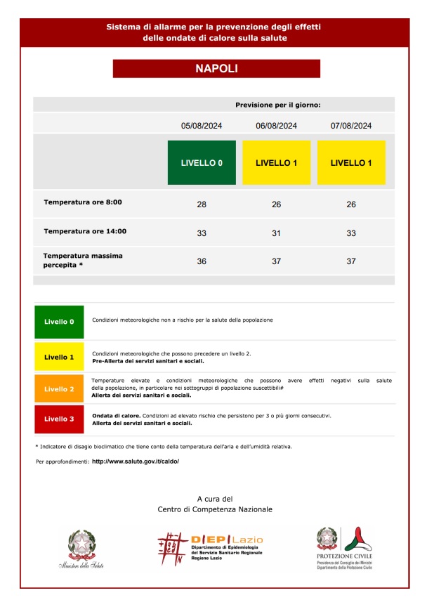 Un avviso di allerta meteo a Napoli è stato emanato dalla Protezione civile regionale per condizioni di criticità per rischio da ondata di calore.