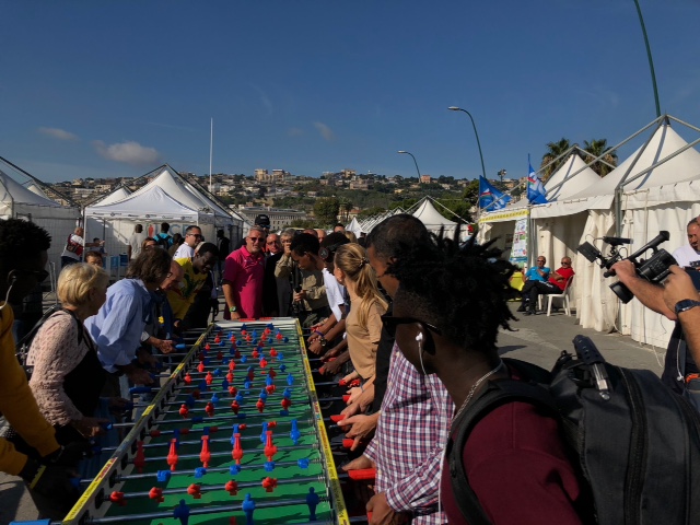 Nelle foto: il cardinale Sepe insieme alla professoressa Colao e ai volontari; un momneto della partita della accoglienza al super biliardino; il vincitore della Prevention Race Alessandro D’Ambrosio e una delle premiazioni finali.