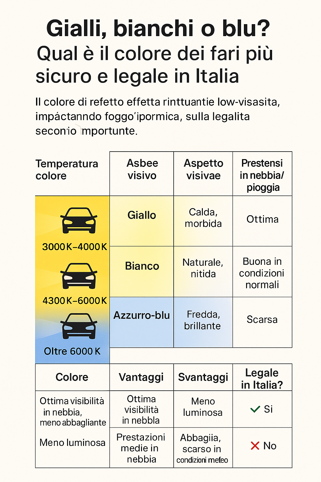 La sicurezza alla guida dipende da molti fattori: attenzione del conducente, condizioni della strada, meteo… e anche dai fari dell’auto. Ma non tutti i fari sono uguali: il colore della luce influisce sulla visibilità, sul comfort visivo e, cosa importante, sulla legalità secondo la normativa italiana.