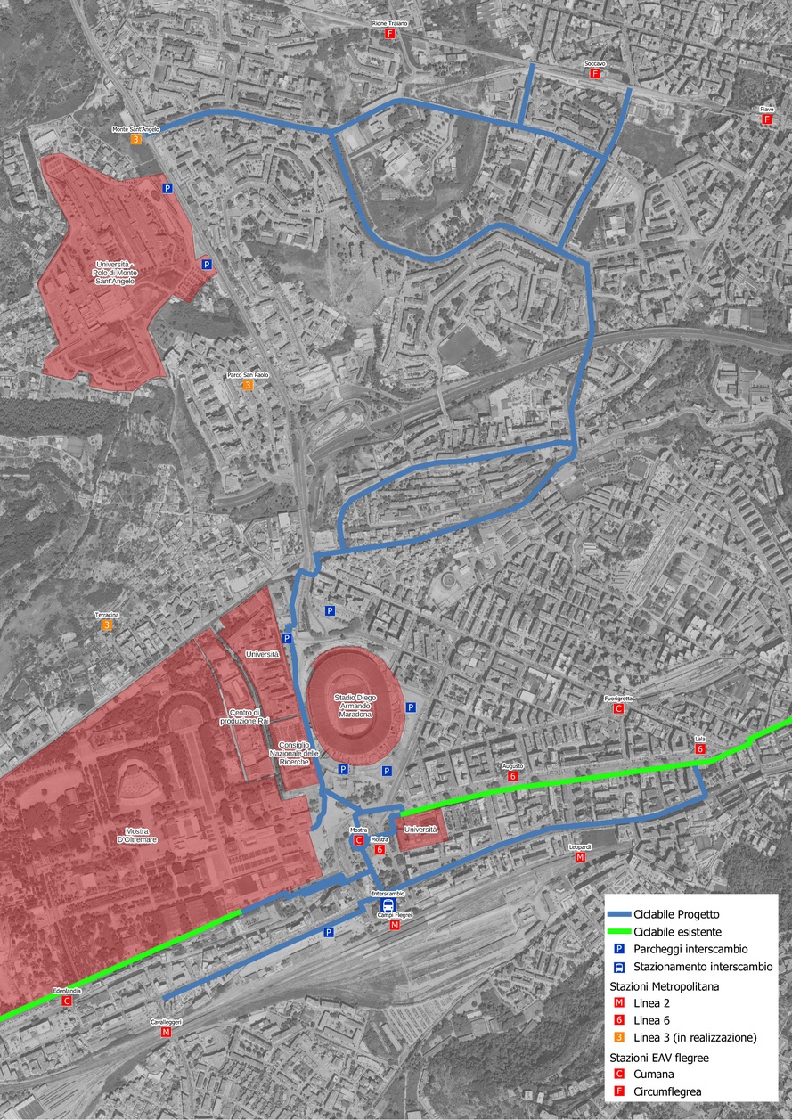 Sono coinvolte le stazioni della Circumflegrea di Soccavo, le stazioni di Fuorigrotta e, in particolare, della Cumana stazione Mostra, della linea 2 stazioni Campi Flegrei e Cavalleggeri, nonché la stazione della linea 6 Mostra che aprirà nel corso del 2024. La nuova rete ciclabile collega i siti dell’Università Federico II di piazzale Tecchio, di via Claudio e di Monte Sant’Angelo. Il nuovo tratto è realizzato in continuità con il tratto di ciclabile già esistente che raggiunge la sede universitaria di Agnano e le stazioni della Cumana di Edenlandia e di Agnano. La rete ciclabile si estenderà anche su via Diocleziano e via Giulio Cesare.