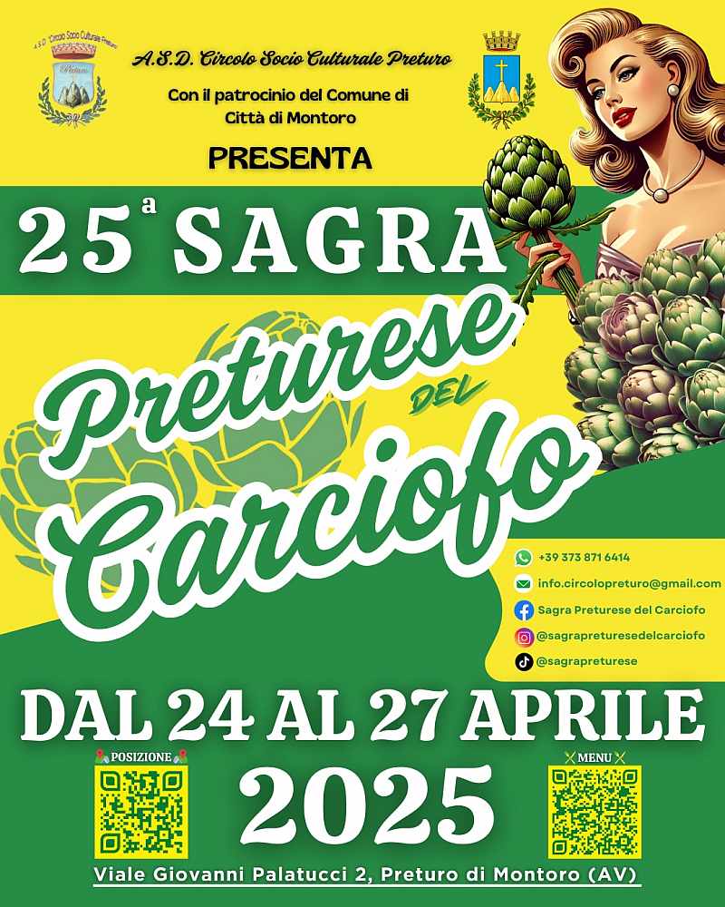 La Sagra Preturese del Carciofo è un evento annuale che celebra il carciofo locale, un prodotto d’eccellenza che deve le sue caratteristiche al terreno fertile della zona di Preturo, una frazione del comune di Montoro, in provincia di Avellino.