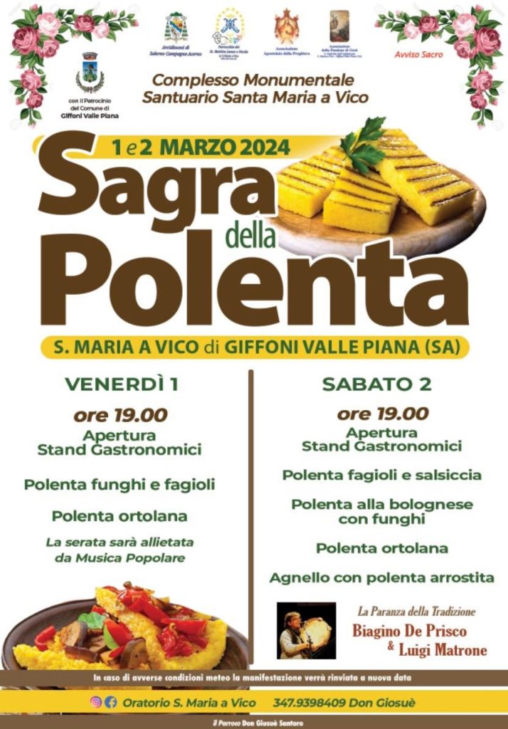 A Santa Maria a Vico, frazione di Giffoni Valle Piana (SA), è in programma la Sagra della Polenta. Quello che una volta veniva considerato un piatto povero, oggi lo si trova nei menù stellati, ma nulla potrà eguagliare la tradizione di paese in scena nei giorni 1 e 2 Marzo 2024, un valore aggiunto indiscutibile!