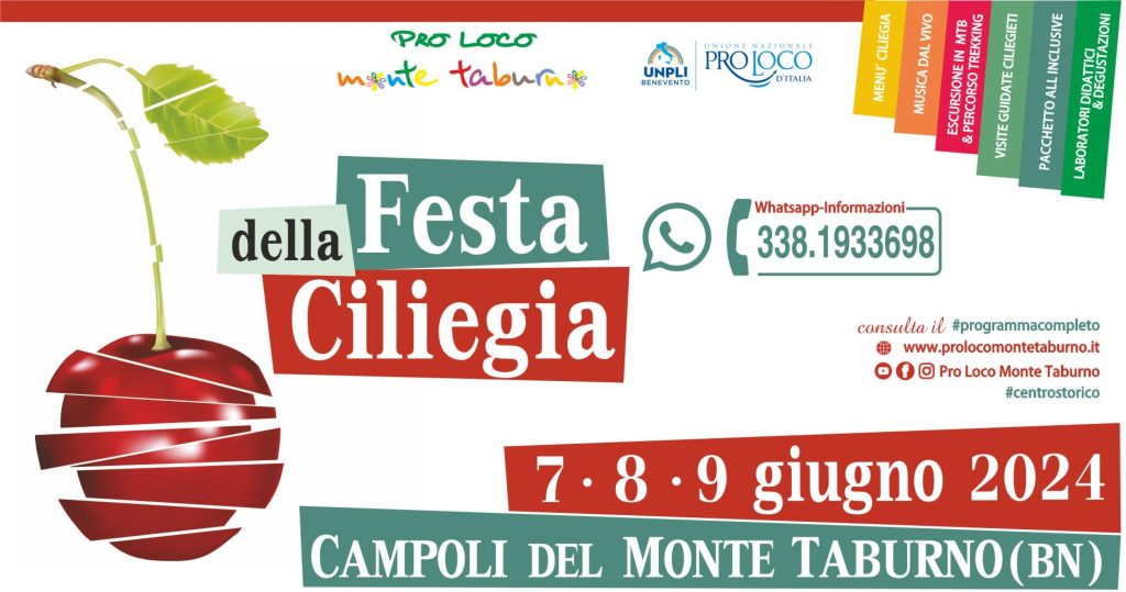 Dal 7 al 9 Giugno 2024 a Campoli del Monte Taburno (BN) si svolgerà la Festa della Ciliegia a cura della Pro Loco e con il Patrocinio del Comune e Unpli provinciale.
