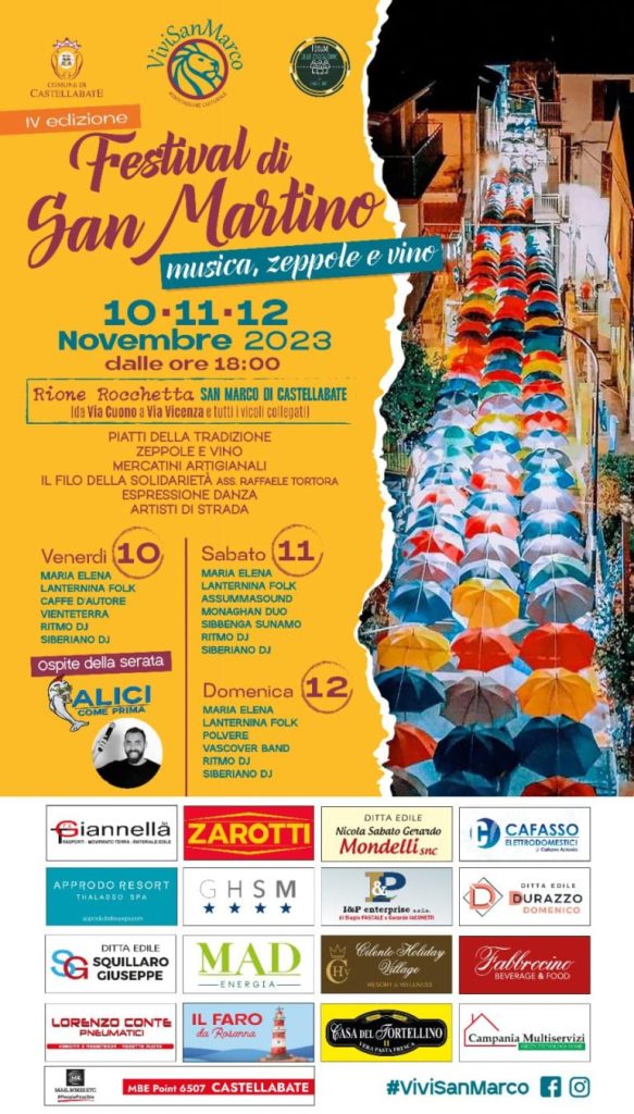 In programma Venerdì 10, Sabato 11 e Domenica 12 Novembre 2023 dalle ore 18:00 a San Marco di Castellabate al Rione Rocchetta il Festival di San Martino “Musica, Zeppole e Vino”.