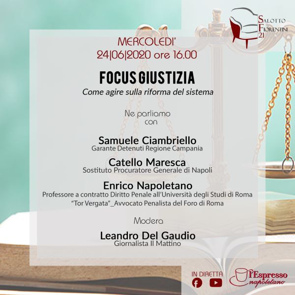 Salotto Fiorentini 21: mercoledì 24 giugno (ore 16) la quinta puntata. Si parlerà di giustizia e come agire sulla riforma del sistema (con ospiti Samuele Ciambriello, Catello Maresca ed Enrico Napoletano. Modera Leandro Del Gaudio).