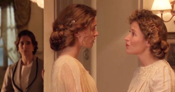 Carolina (Alejandra Llorente) bussa alla porta di Adela (Celia Freijeiro). Indossa l’abito che Germán (Oriol Tarrasón) le aveva donato qualche giorno prima.