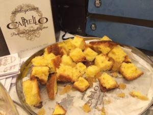 Solofra in provincia di Avellino, che si forma nella Pasticceria di famiglia. I suoi prodotti innovativi sono il Panettone ai carboni vegetali, in versione al cioccolato, al caffè, all’Aglianico, al Taurasi e al Fiano. Luigi e Michele Cappiello due fratelli esplosivi della Pasticceria Gelateria e Caffetteria di S. Maria Capua Vetere che hanno fatto degustare la versione classica con canditi e uvetta sultanina, all’ananas,con frutti di bosco e al cioccolato. Marco Tateo titolare di Divine Tentazioni di Brindisi, Puglia con prelibatezze a base di crema, cioccolato e frutta. Carmen Vecchione di Dolciarte di Avellino con una pasticceria innovativa e di pregiata qualità. I Grandi Lievitati Ricci di Montaquila nel cuore del Molise. Produttori di pane, biscotti e lievitati di alta qualità. Il Miele è il protagonista proveniente dal Parco Nazionale d’Abruzzo,uva sultanina Australiana senza solfiti, tuorli d’uova freschi provenienti da allevamenti a terra Molisani, la scorza di arance Navel, il cedro diamante, i limoni della Costiera Amalfitana, le pere “carbone” autoctone candite all’italiana direttamente in azienda. Forno Sammarco di Cera Antonio di Foggia che ha presentato lavorati Natalizi realizzati mediante la lavorazione di grano arso, con uva di zibibbo o fichi e panettoni di grano tenero con agrumi del Gargano.