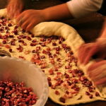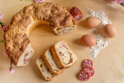 Ingredienti: 500 gr. di farina, 1 cubetto di lievito di birra, 100 gr, di prosciutto a dadini, 100 gr. di salame, 100 gr. di provolone piccante tagliato a cubetti e 100 gr. di emmenthal tagliato a cubetti, 4 uova sode di galline allevate all’aria aperta, 1 pizzico di sale,1 pizzico di pepe. La cottura avviene intorno ai 160-170 ºC per circa 60-75 minuti.
