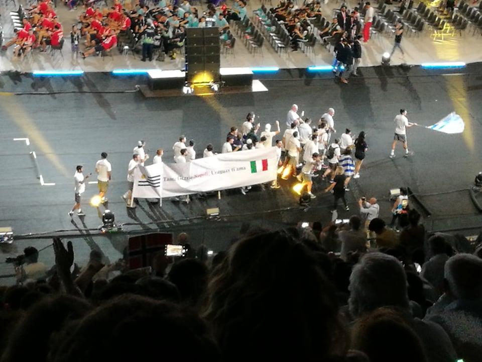 Al centro dell’impianto di Fuorigrotta, la gigantesca lettera U delle Universiadi si è sovrapposta idealmente al Golfo, riempiendosi pian piano con tutti gli entusiasti atleti dei Giochi Universitari, tutti uniti in un ideale abbraccio all’insegna dello sport come valore di fratellanza. Tra i più applauditi, quelli dell’Argentina (che portavano con sé la numero 10 di Maradona, accompagnati dal coro “Diego, Diego”), del Brasile (che hanno indossato dei grembiuli in omaggio alla pizza e ai pizzaiuoli) e dell’Uruguay (che hanno ringraziato Napoli con uno striscione).